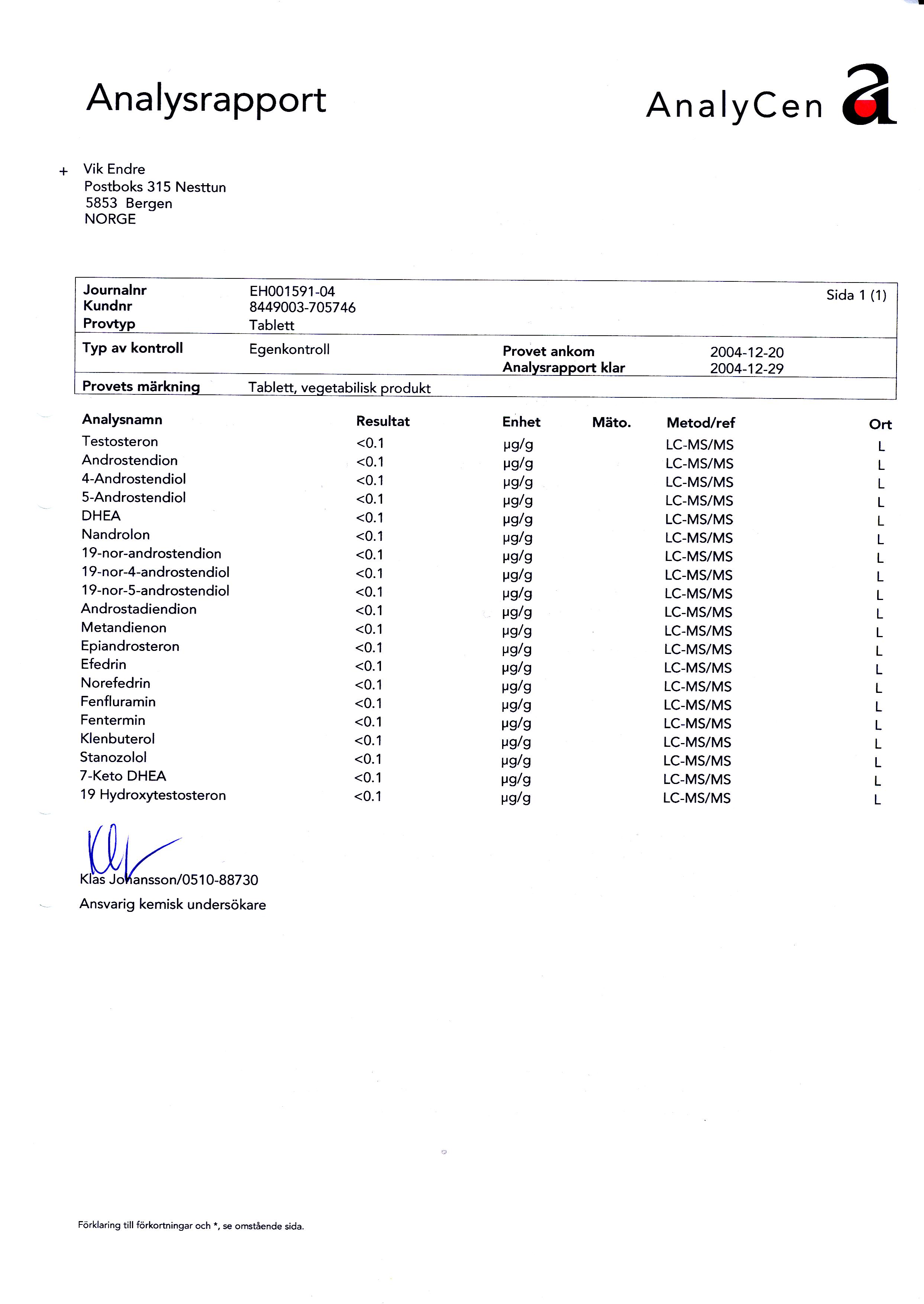 Vi har benyttet oss av det nordiske laboratoriesamarbeidet ANALYCEN ved hovedlaboratoriet i Lidkjøping i Sverige. Det kommer vi til å gjøre regelmessig ved all ny produksjon ved fabrikkanlegget som har høyeste EU-godkjenning for renhet og hygiene og som ligger i Norge.